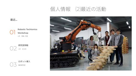 ⑵ 最近(jìn)の活動について以上(shàng)の3點を紹介しました。この畫(huàγα¶λ)像は研究室のロボット研究グループの班員と共に青島理(lǐ≥&)工(gōng)大(dà)學/DAMlabのロボティック構築ワークショップに參加したときのものです。一(yī)番右で目を∑±閉じてしまっているのが私です。