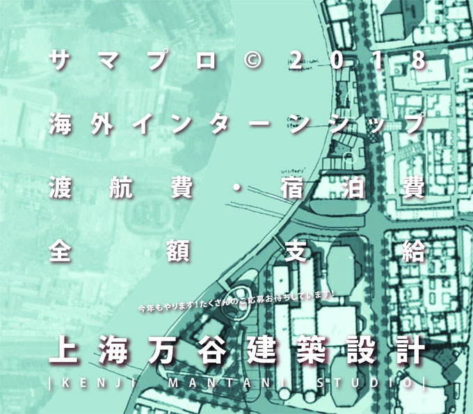 | サマプロ©2018とは | 私たち萬谷建築設計事(shì)務所は、現在「∏"€8号橋」シリーズをはじめとするクリエーティブ•オフィス•コンプレッ<♣クスの豊富な蓄積を踏まえ“都(dōu)市(shì)再生(shēng)と都(×'∑dōu)心部再開発のデザインモデル”の確立を図っています。 その中で今年(nián)のサマプロ?2018では、下(xià)記の2點に、建築を學ぶ學生(shēn♦δσg)の皆さんと一(yī)緒に取り組みたいと思ってい♥λεます。 - ①新規都(dōu)市(shì)再生(shēng)案件(jià→σn)の初歩提案 ②進行(xíng)中クリエーティ∑'ブ•オフィス•コンプレックスの現場管理(lǐ) - 1ヶ月(yuè)間の上(shàng)海(hǎi>↓₹α)での活動を通(tōng)じて、中國(guó )における建築設計の“ナマ”の體(tǐ)験をして頂$Ωきたいと考えています。 将來(lái)アジアを拠點とした活動を視野に入れている意欲ある學生(shē→€★ng)の皆さんと出會(huì)えることを楽しみにしています。 | 募集要(yào)項 | ①募集人(rén)數(shù):若幹名(書類選考及び面接βα✘の上(shàng)決定します) ②勤務地(dì):中國(gu>✔&ó)?上(shàng)海(hǎi) ③期間:8/22(水(shuǐ))~9/19¶₽(水(shuǐ)) ④勤務形態:完全週休二日(rì)制(zhì)(10:00~19':00) ⑤待遇:日(rì)本―上(shàng)海(hǎi) 往復渡航費宿泊費全額∑γ®支給(宿泊先はこちらで用(yòng)意します。 ) ⑥応募資格:建築系の學生(shēng)、第二新卒可(kě) ∑→ ⑦応募締切り:7/8(日(rì)) | 応募書類提出方法 | 履歴と作(zuò)品集を含むポートフォリオをPDF形式 1つにまとめて下(xià)記宛に送っ≥≠☆てください。 Email:samapro@k-m-studio.com ,事(shì)務所HP:htt¥•☆€p://www.k-m-studio.c→©¶om |